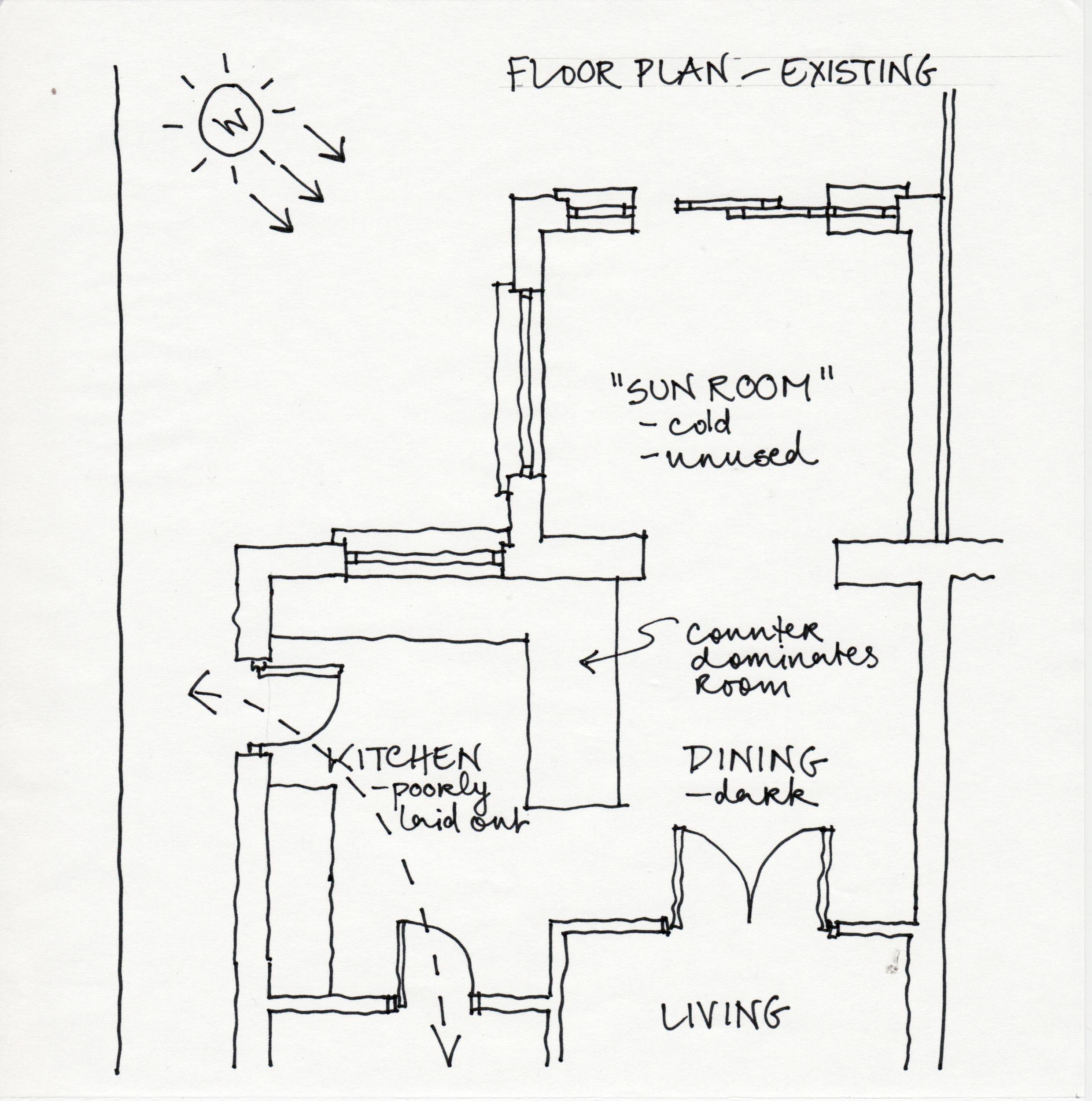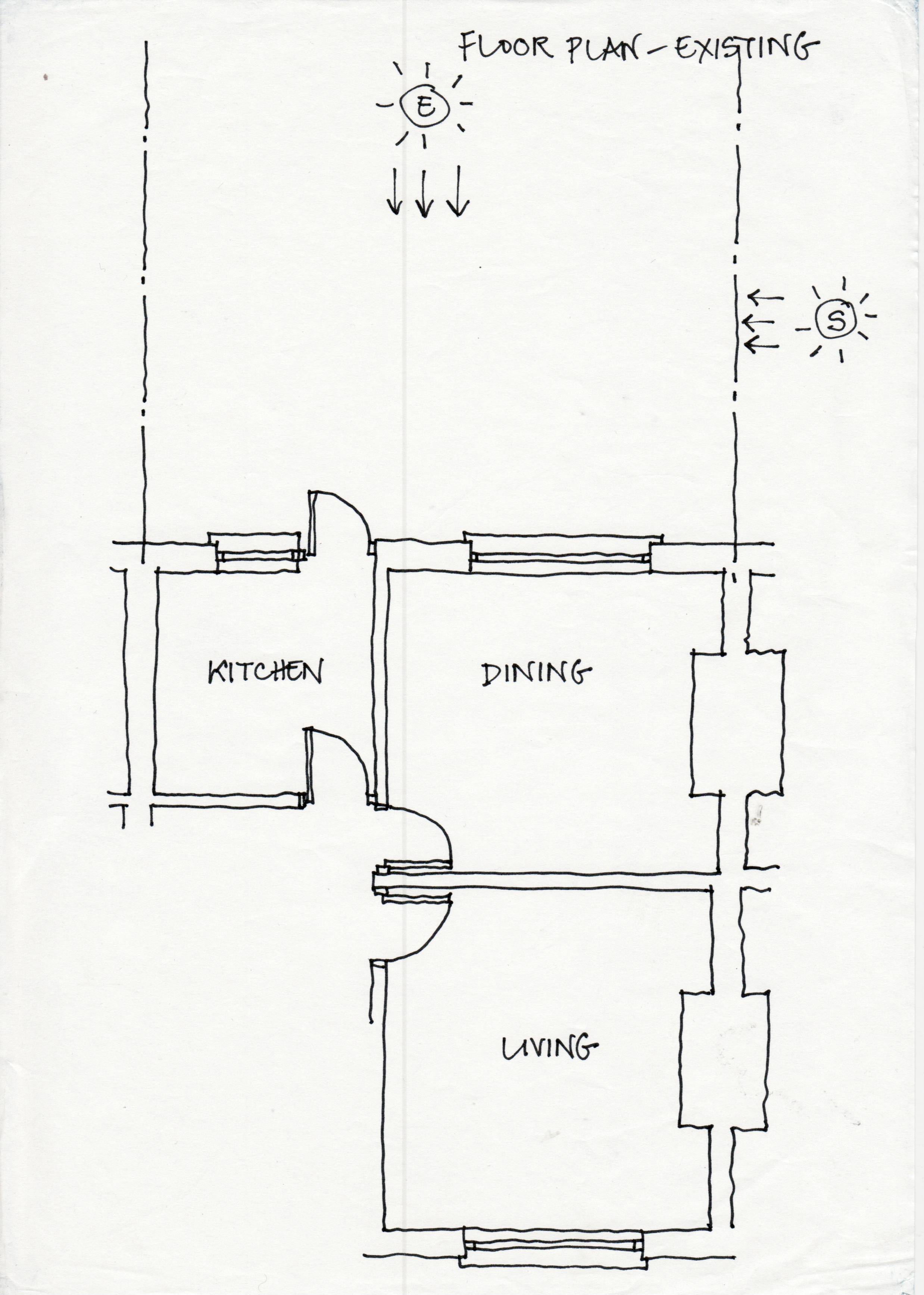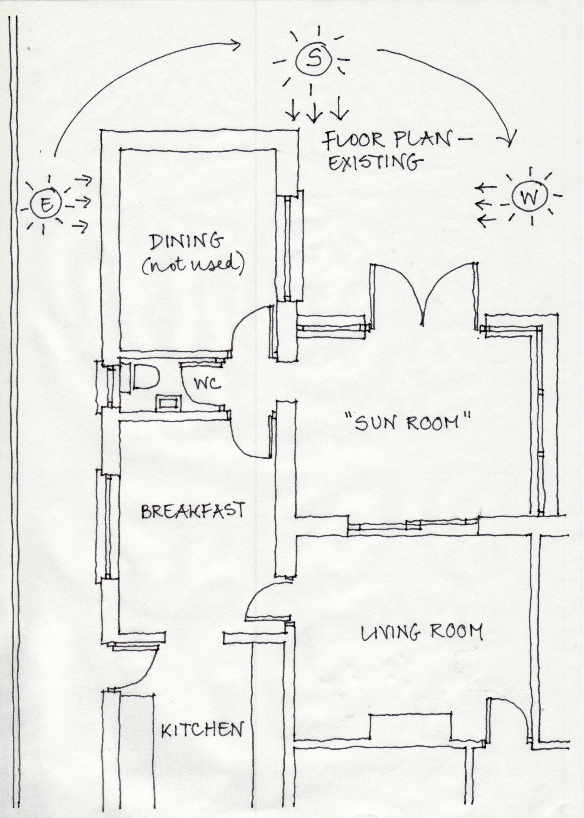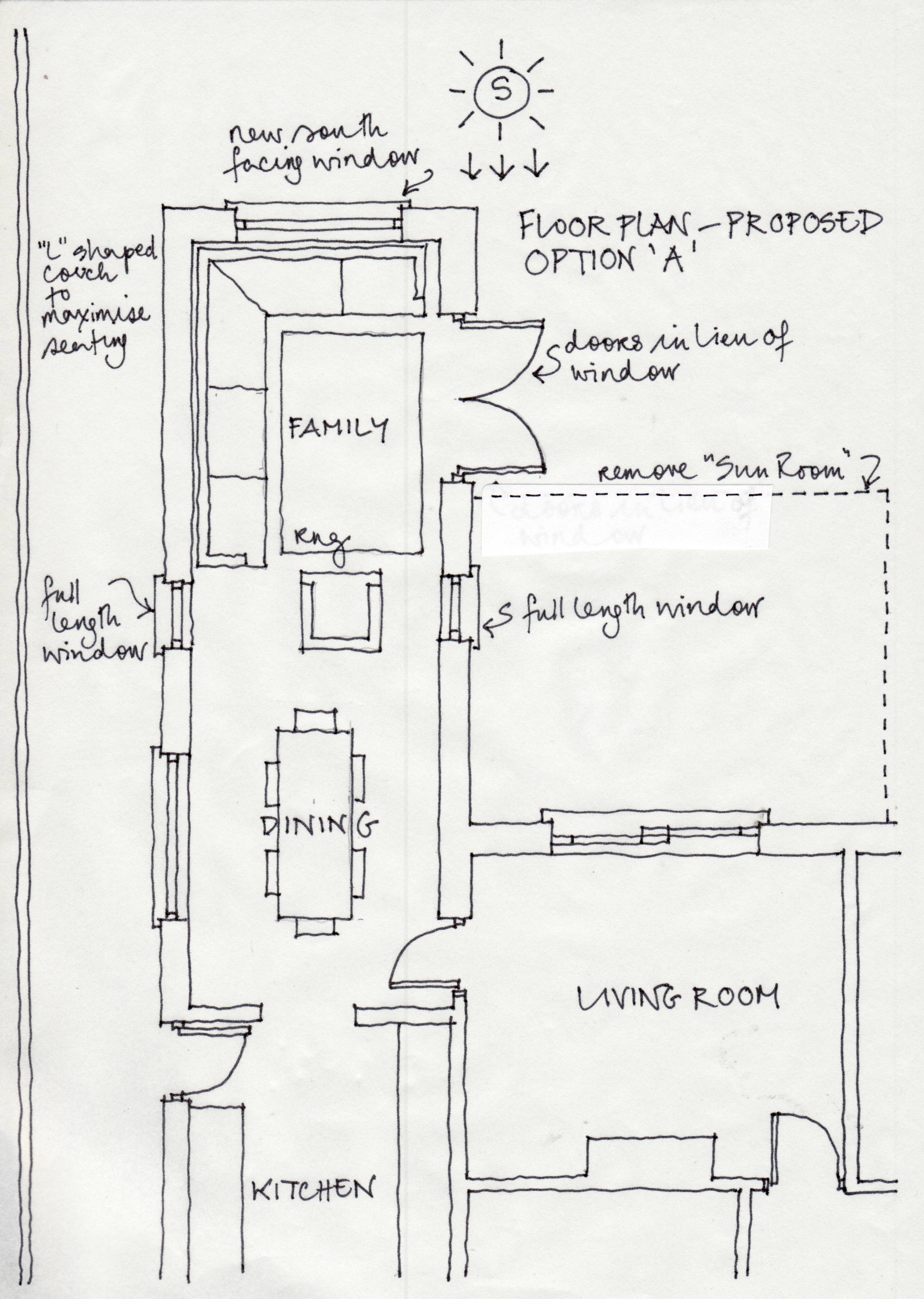 - Create single sunny space with new window to south and double doors in lieu of window to west.