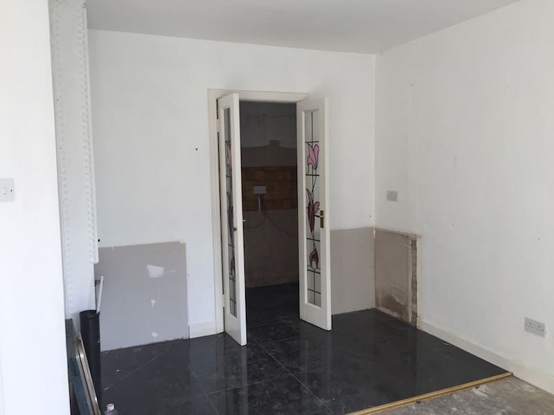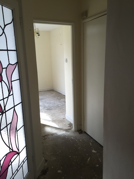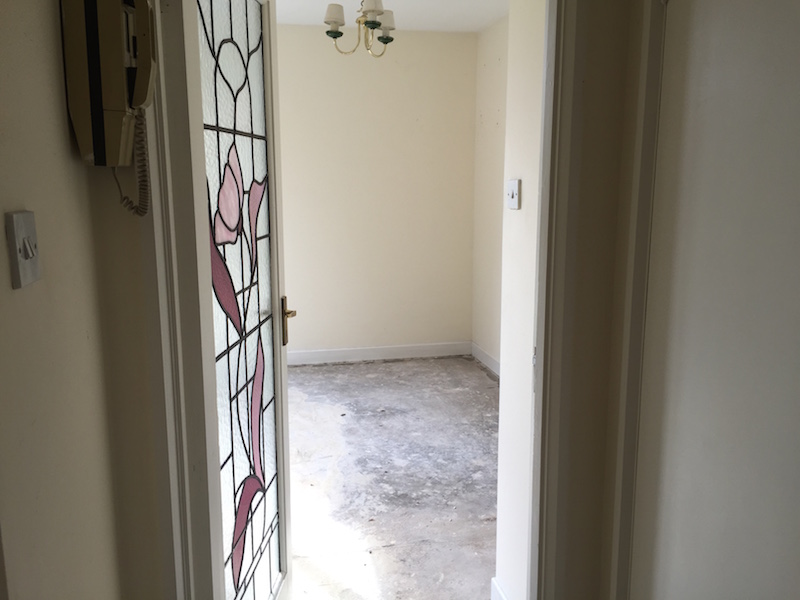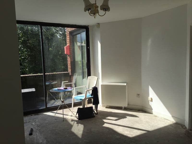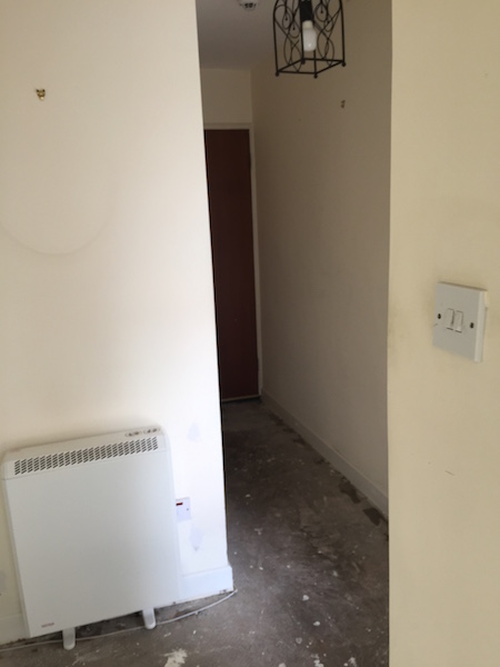 - LIVING ROOM: dominated by a storage heater and hampered by not being able to put the sofa opposite the fireplace due to the the position of door to the hall.