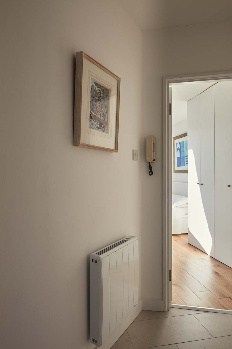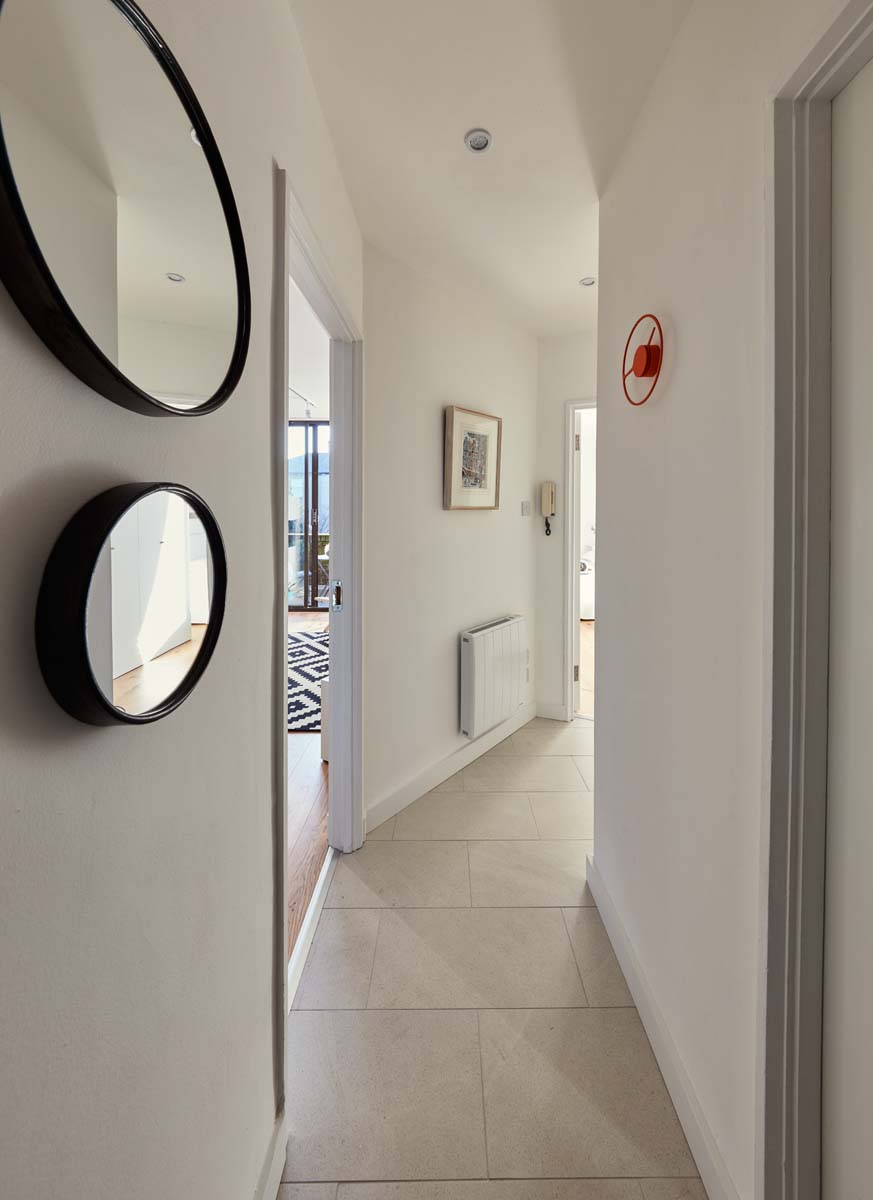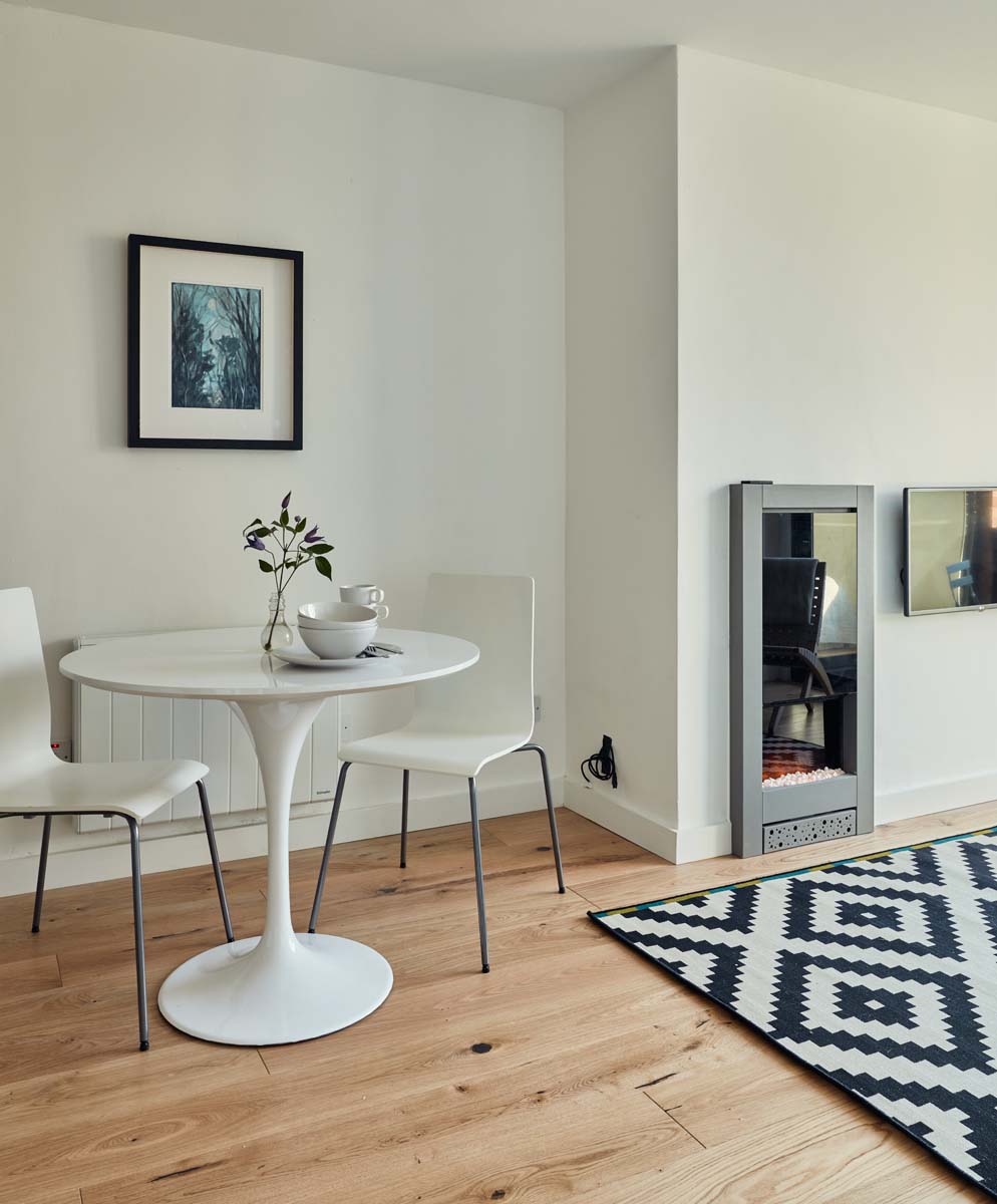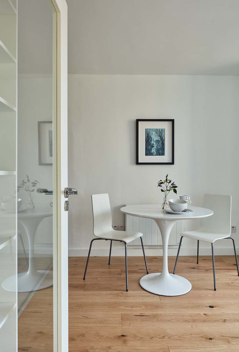 - FINISHES: a simple palette of floor finishes was used throughout, with oak boards in the living and bedroom areas and white terrazzo style tiles in the hall, bathroom and kitchen. The walls are white with art works chosen and located to add colour at key points. The table and couch are modest, to fit best with the scale of the space. Track lighting and spotlights were used as an alternative to recessed downlighters.