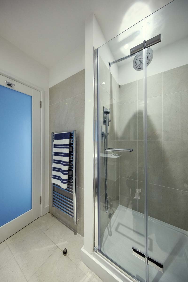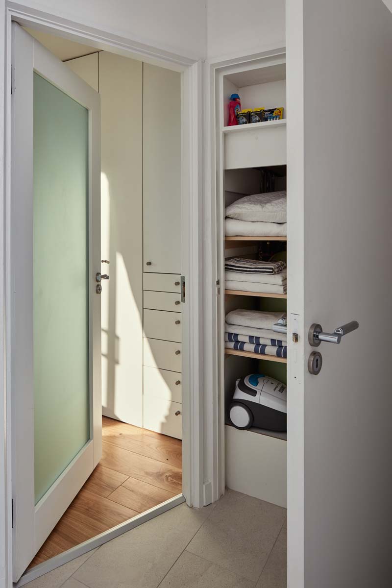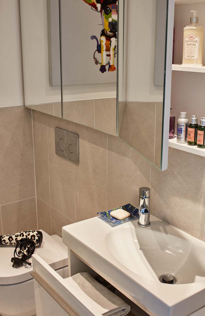 - BATHROOM: We created instead a shower room with a 90 x 90 cm shower in a new alcove created by the laundry cupboard. A wall hung-toilet and wash basin were placed side by side on the opposite wall. The 15 cm recess created by the concealed cistern for the wall-hung toilet was used to create handy, hidden storage the full width of the wall. The mirrored doors to this storage conceal adjustable shelving and create the illusion of a larger space. The wash basin also has storage drawers under.
