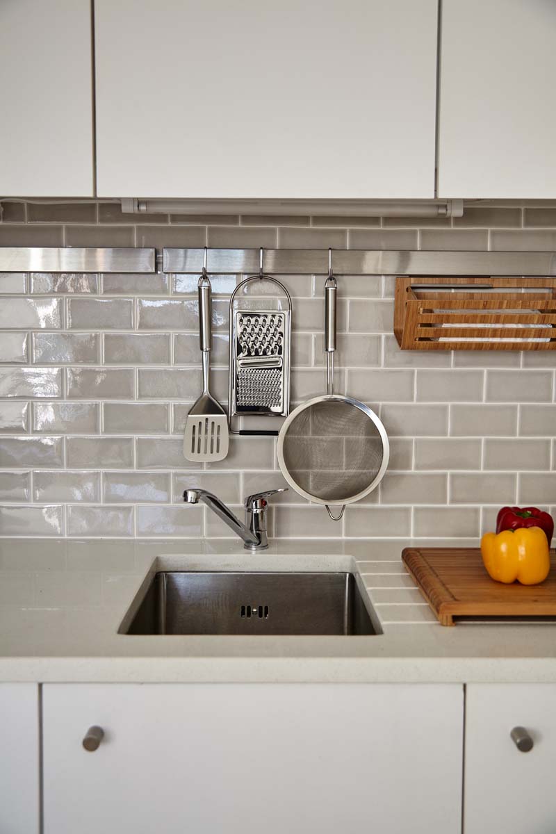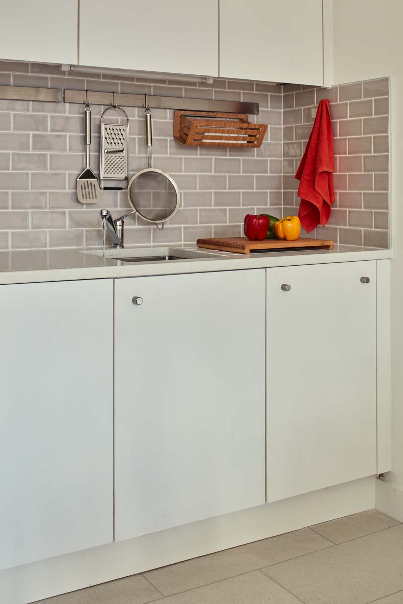 - KITCHEN: the units were re-organised into an “L” shape, leaving only one corner (always problematic in a kitchen). The units are in sprayed mdf, with adjustable shelves at an upper level and pull out units below counter.