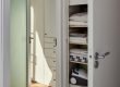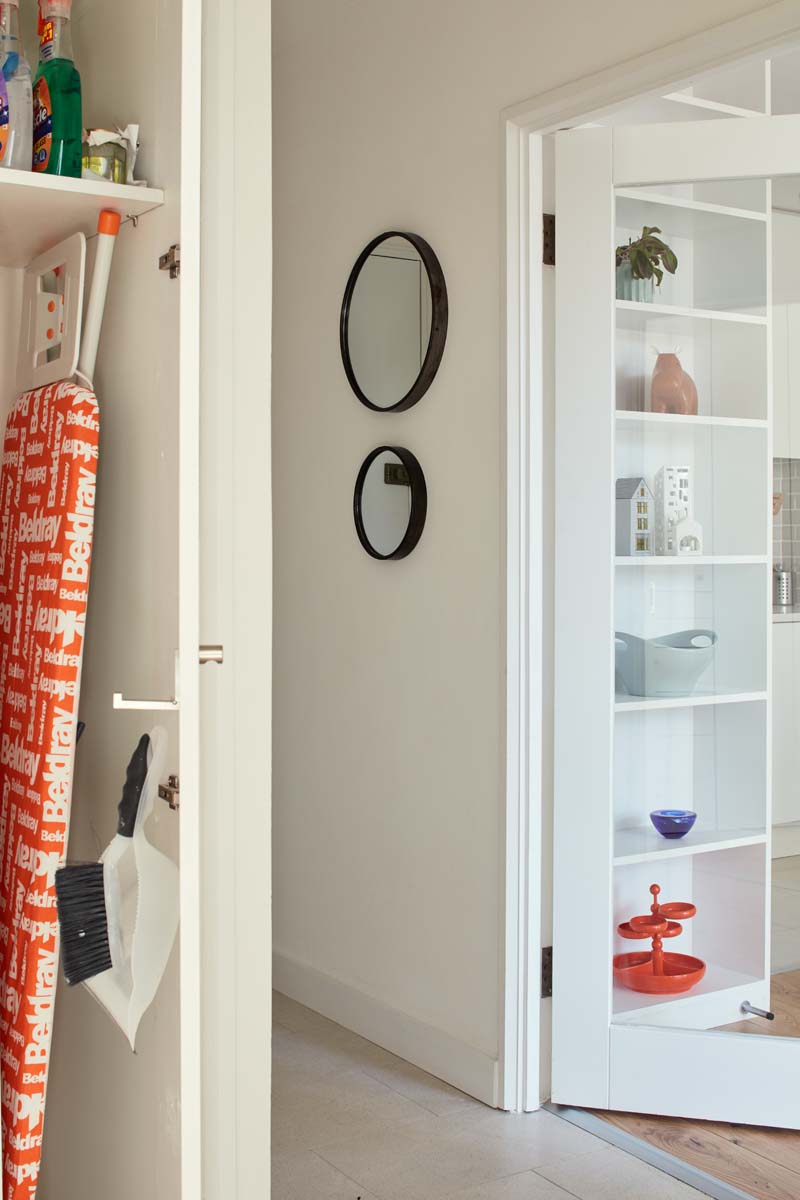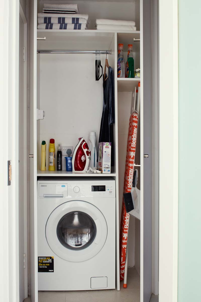 - HALL: We “borrowed” space from the over-large bathroom to create a laundry cupboard in the hall. This is 90 cm wide and comprises, on one side, a counter over a washer/dryer. A hanging rail 120 cm above this provides useful hanging, with shelves overhead for little used items. A tall slot alongside this arrangement provides a home for the ironing board and brooms.