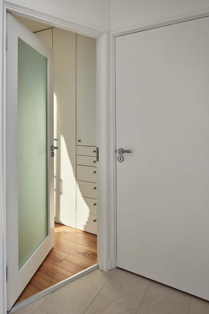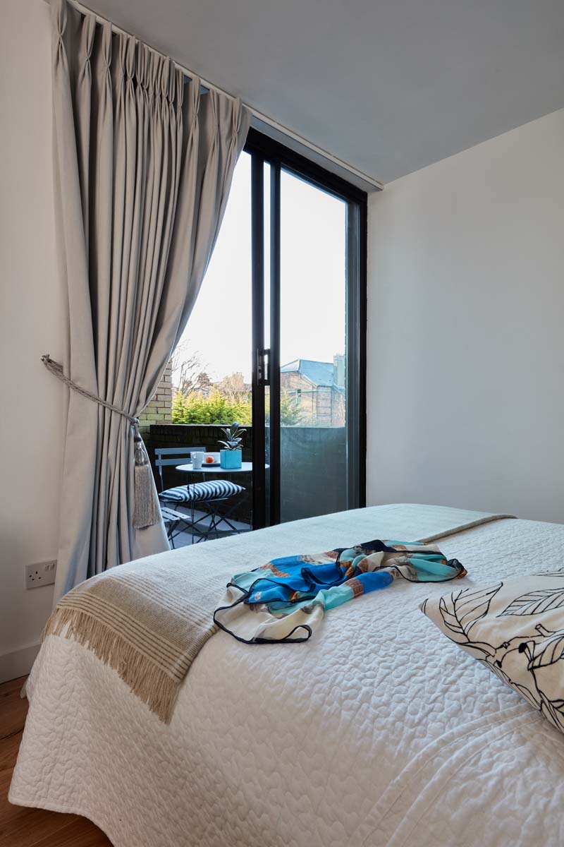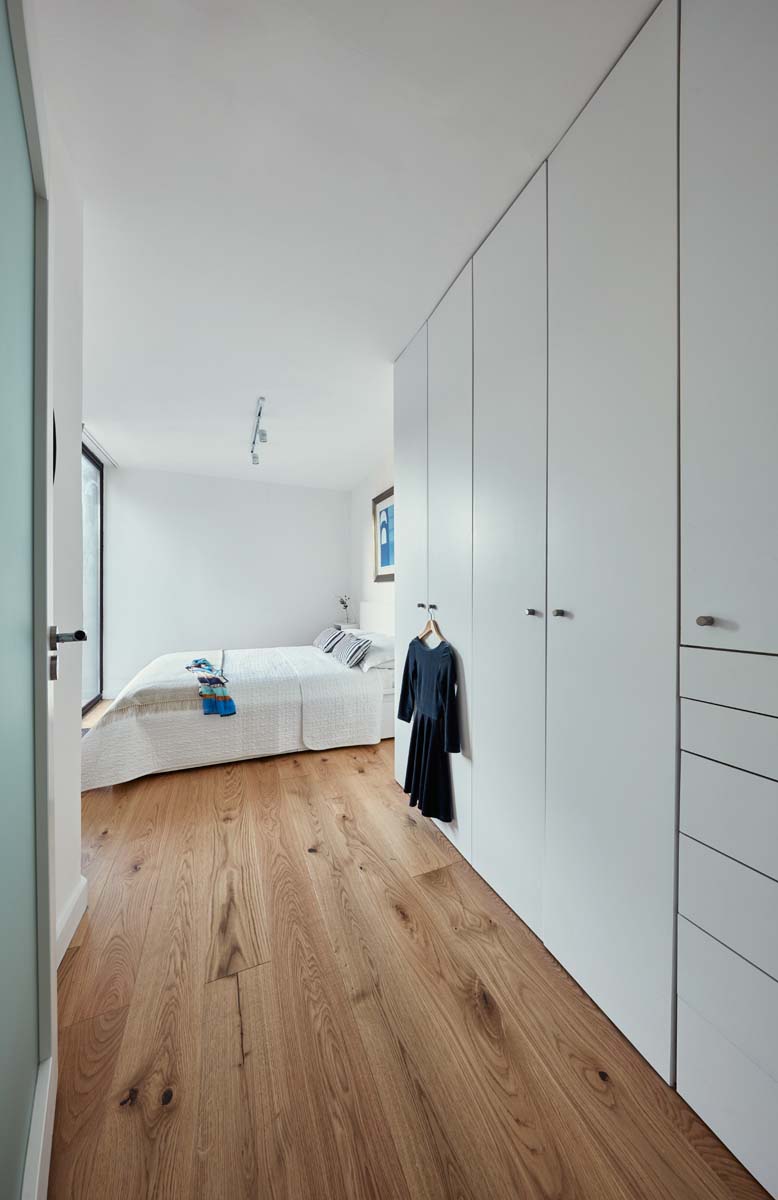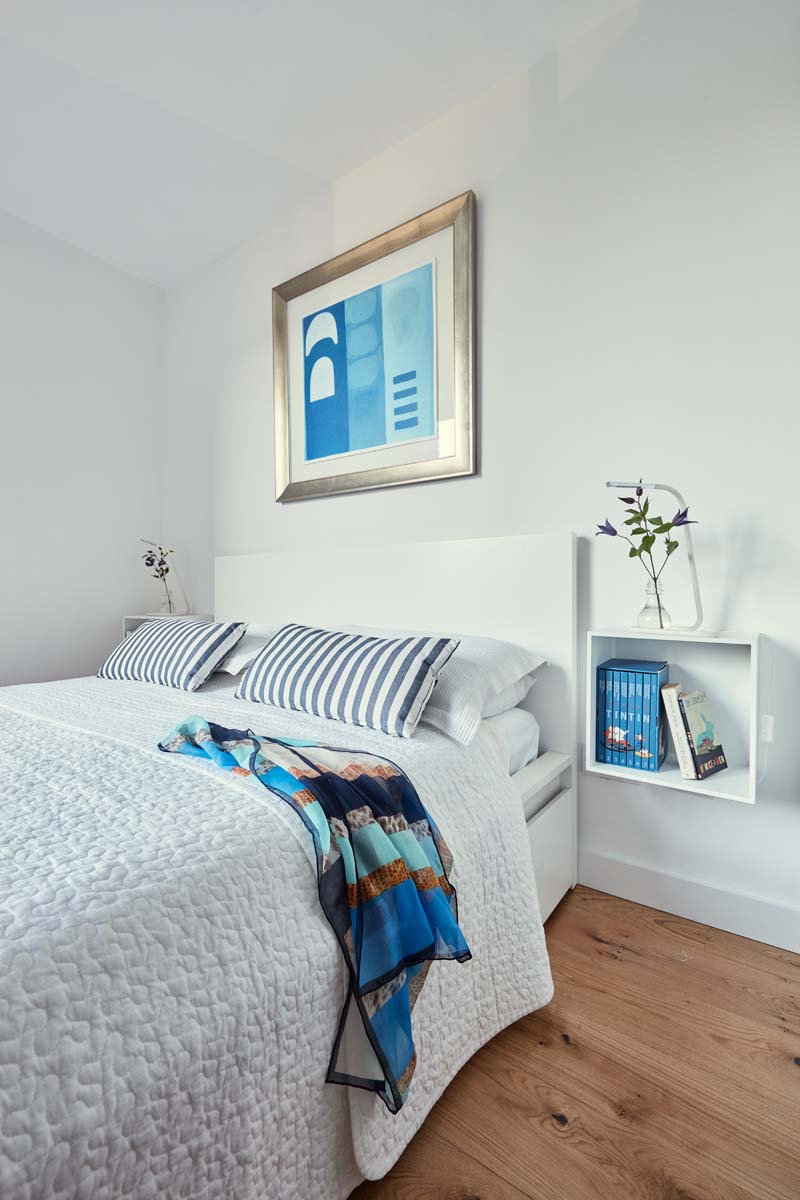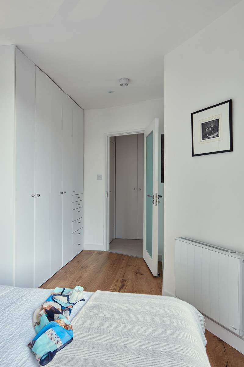 - BEDROOM: Once again, we “borrowed” space from the hall, incorporating a former cloaks cupboard into the room. This allowed us to create a long run of simple wardrobes in the space before the bed, forming a dressing area. The bed, incorporating storage drawers, was rotated to face the window, altogether a more pleasant place to wake in the morning.